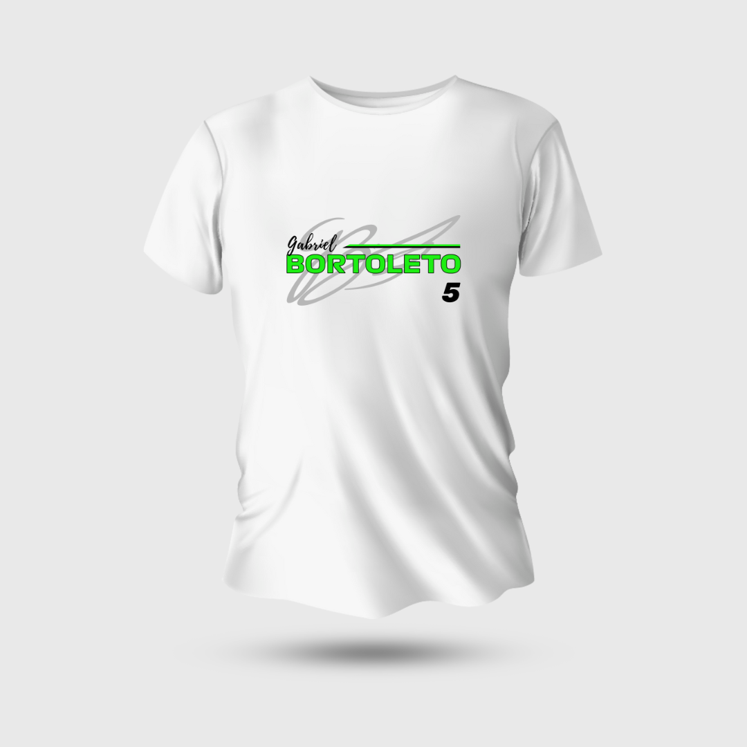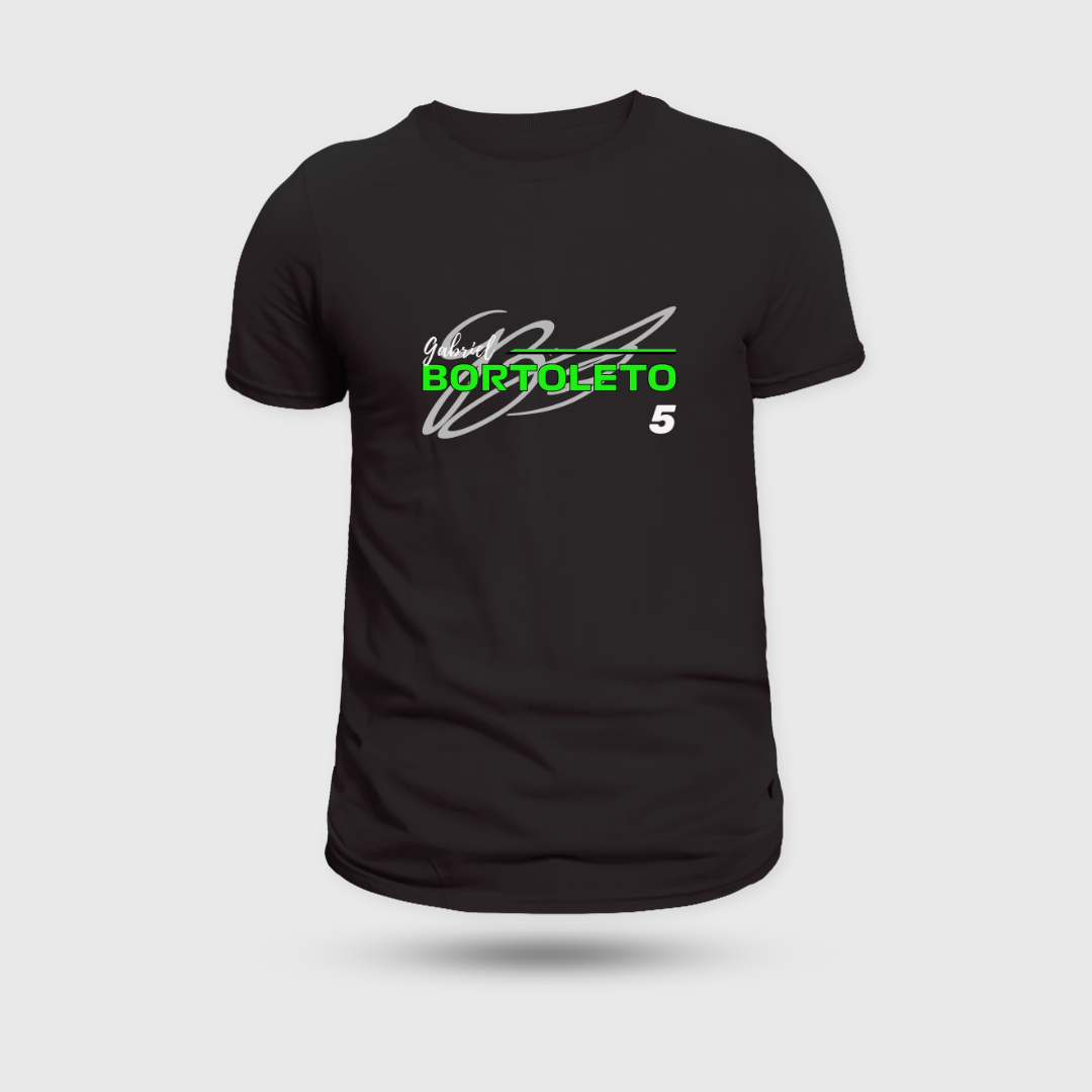 Gabriel Bortoleto representa o retorno do Brasil à Fórmula 1, e essa camiseta foi feita para os fãs que querem carregar esse orgulho no peito. O design traz seu nome em destaque, o número 5 e uma assinatura estilizada, em um visual moderno com o verde vibrante que remete à nossa bandeira.