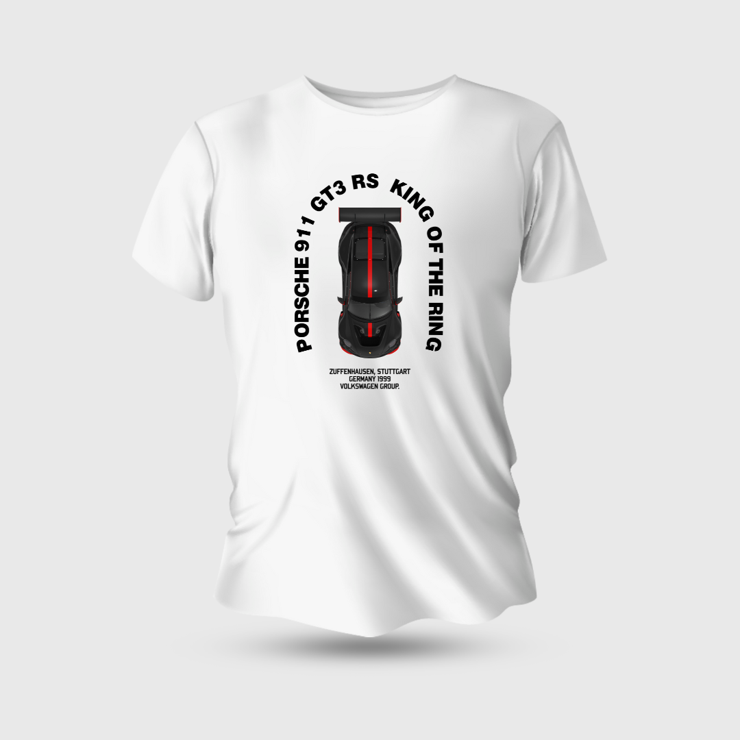 O Porsche 911 GT3 RS é o verdadeiro rei de Nürburgring, o circuito mais desafiador do mundo. Essa camiseta traz uma visão de cima do superesportivo, destacando suas linhas agressivas e a icônica faixa central em vermelho, símbolo de performance e velocidade.