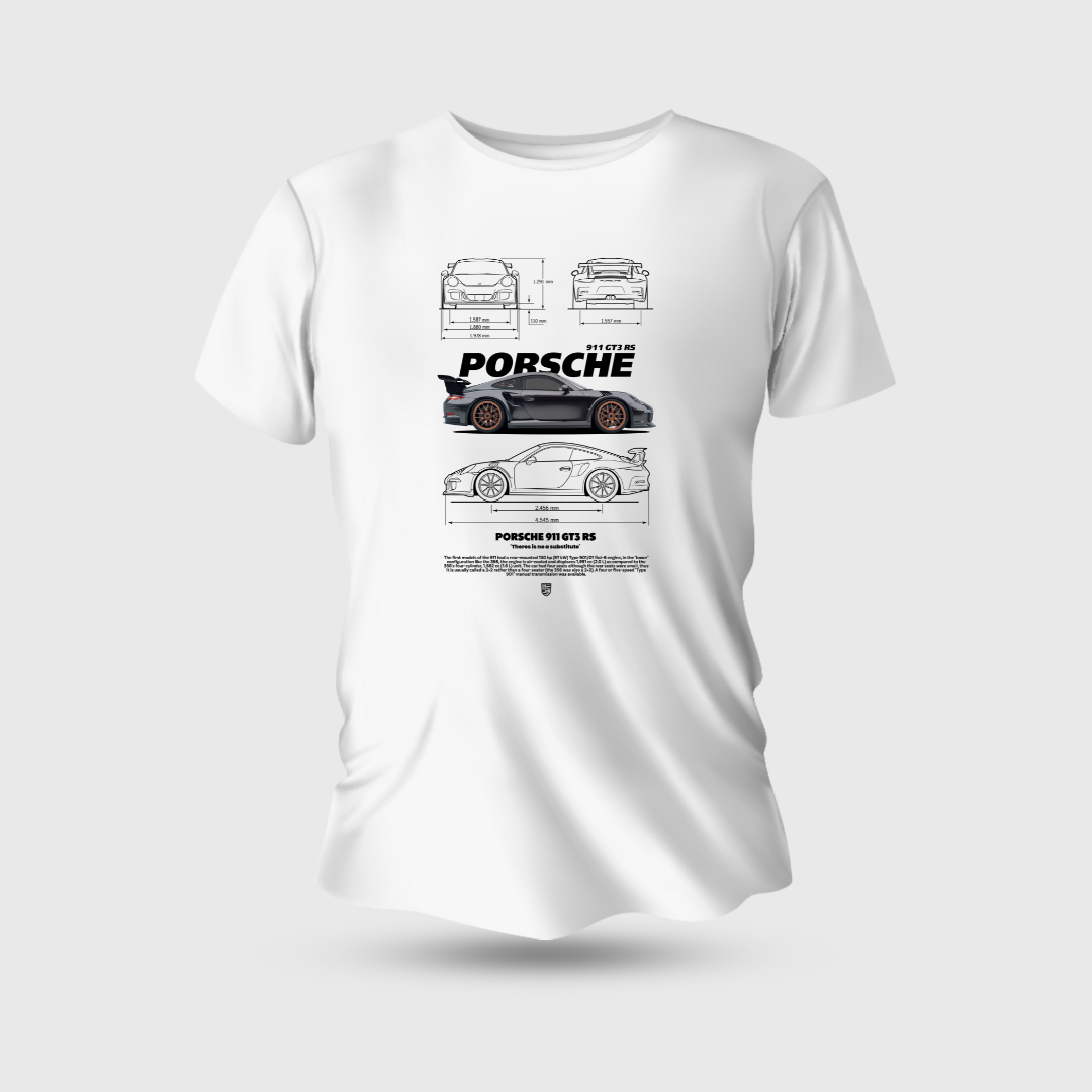 O Porsche 911 GT3 RS é sinônimo de precisão e performance. Essa camiseta celebra a engenharia alemã com uma estampa que mistura arte e técnica: o carro em destaque, rodeado de suas proporções e desenhos técnicos, como em um verdadeiro blueprint de pista.