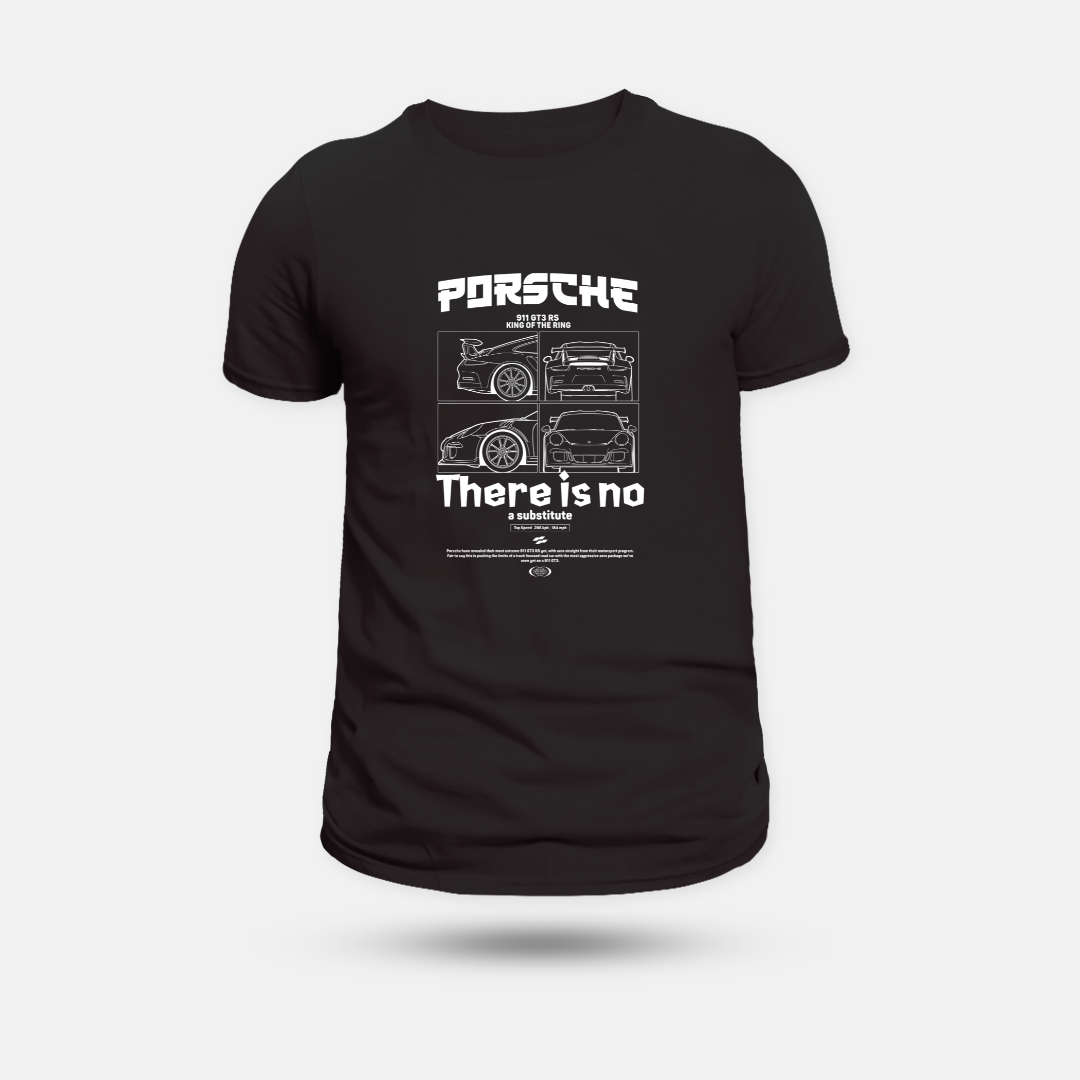 Não existe substituto para um Porsche. Essa camiseta celebra o lendário 911 GT3 RS, rei de Nürburgring, com uma estampa que mistura arte técnica e o lema que resume toda a filosofia da marca: performance, design e paixão sem igual.